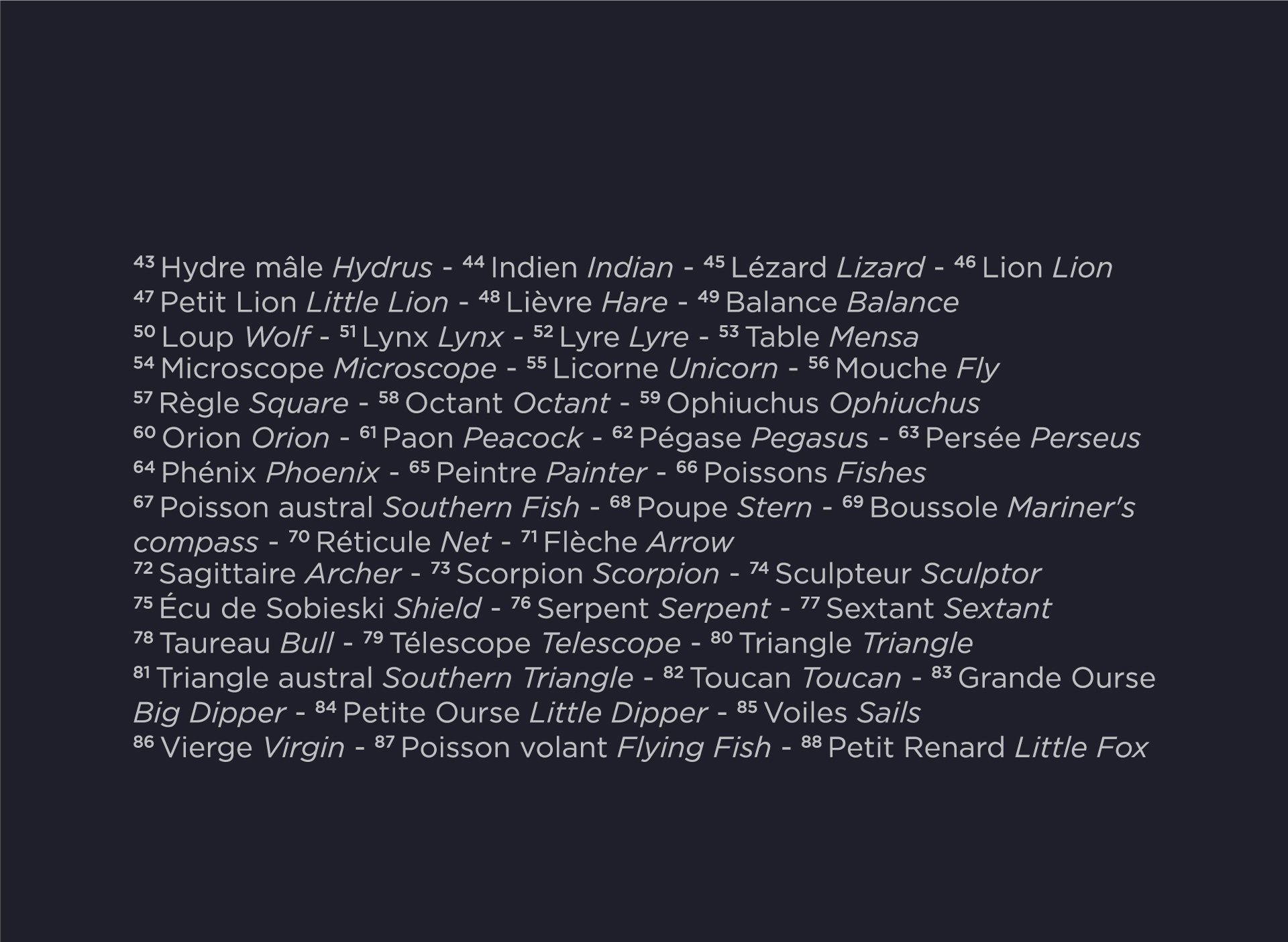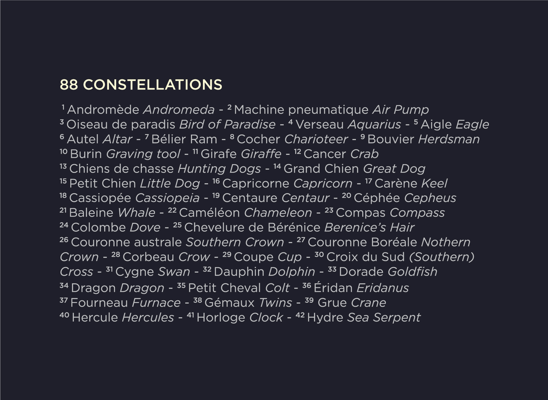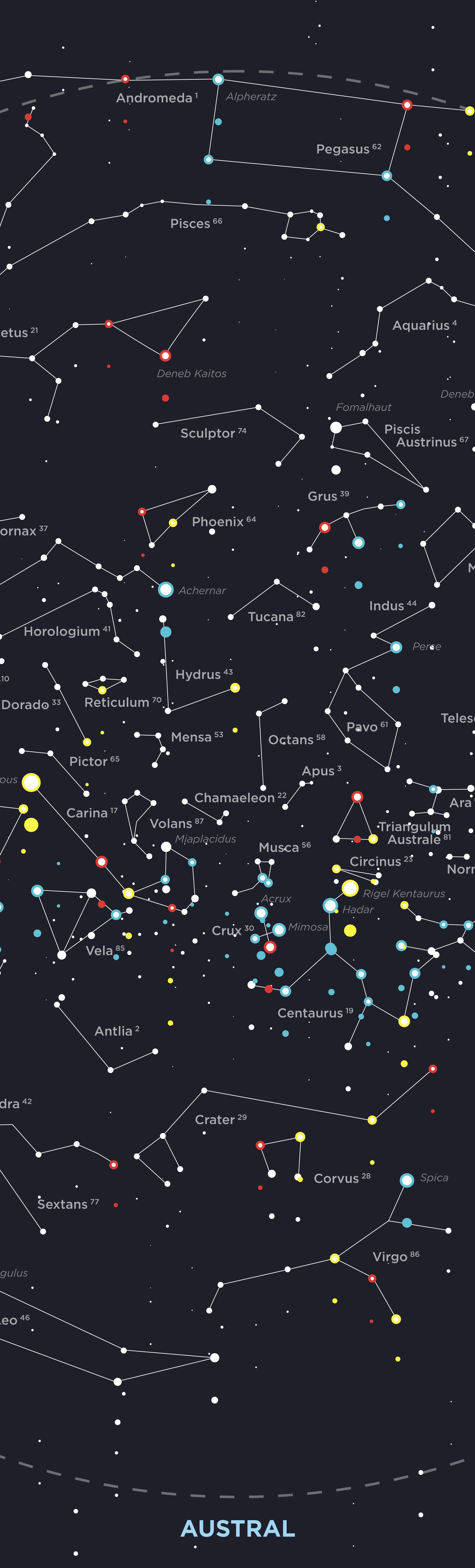 Carte du ciel austral et boréal avec étoiles et constellations ainsi que leurs noms.
